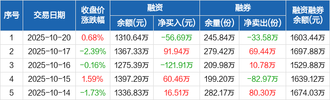 A500ETF南方:融资净偿还56.69万元,融资余额1310.64万元(10-20)