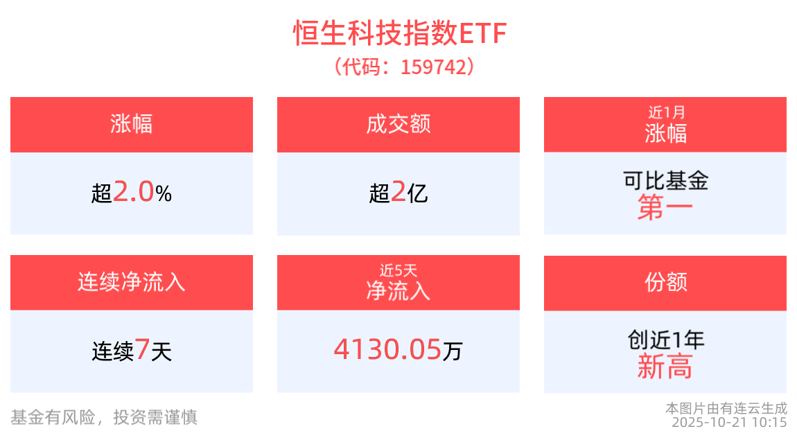 截至2025年10月21日 10:15,恒生科技指数强势上涨2.44%,成分股哔哩哔哩-W上涨8.40%,地平线机器人-W上涨4.84%,中芯国际上涨4.39%,比亚迪电子,小鹏汽车-W等个股跟涨。恒生科技指数ETF(159742)上涨2.09%,最新价报0.83元。拉长时间看,截至2025年10月20日,恒生科技指数ETF近3月累计上涨8.26%,涨幅排名可比基金1/11。