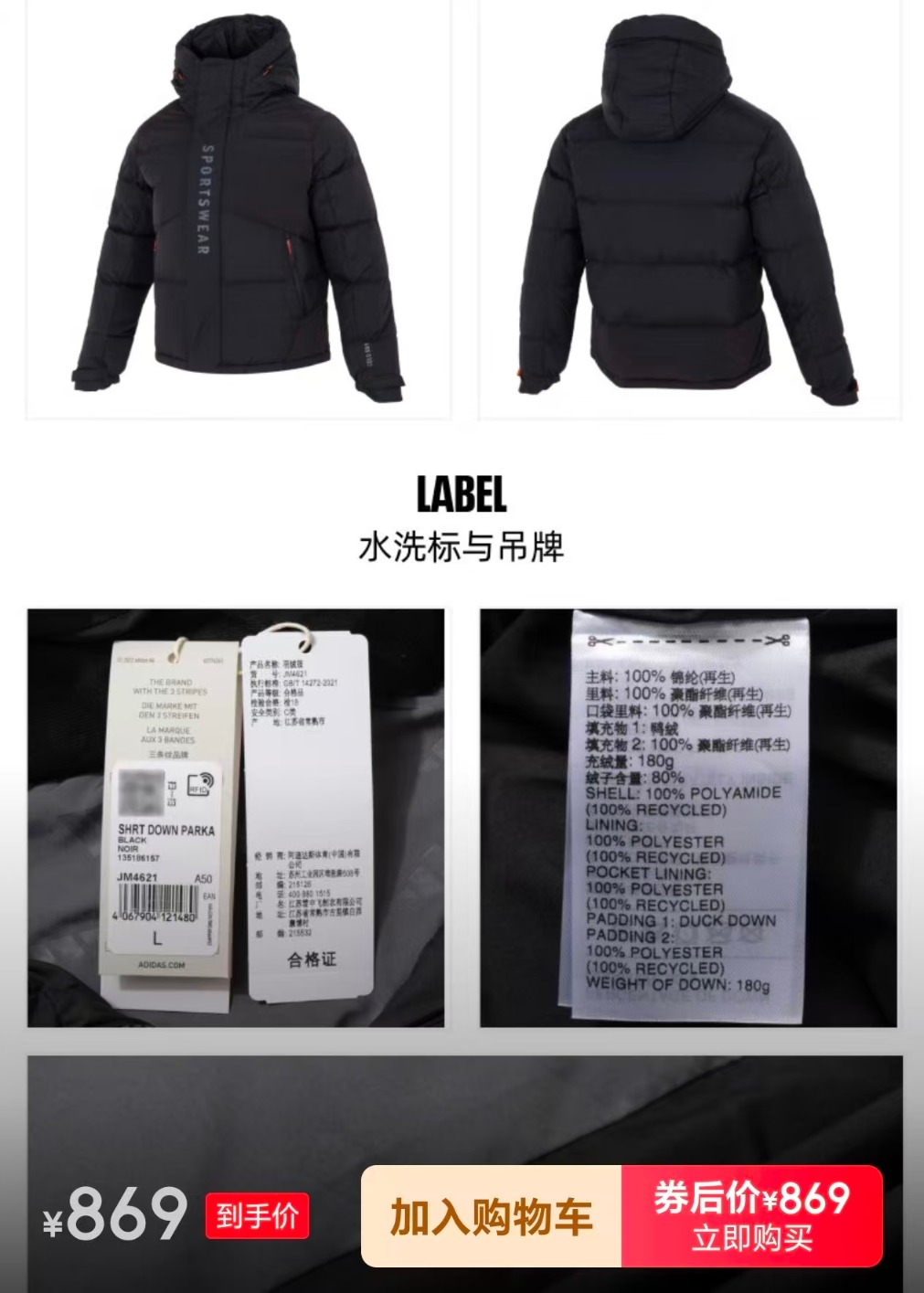 网友发布的阿迪达斯羽绒服代工标签