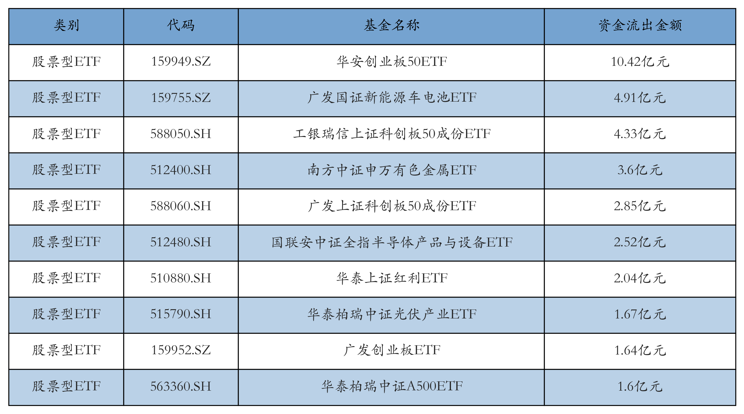 昨日股票型ETF资金流出最多的3只ETF及其流出金额分别为:华安创业板50ETF(流出10.42亿元)、广发国证新能源车电池ETF(流出4.91亿元)、工银瑞信上证科创板50成份ETF(流出4.33亿元)。资金流出前10详情见下表: