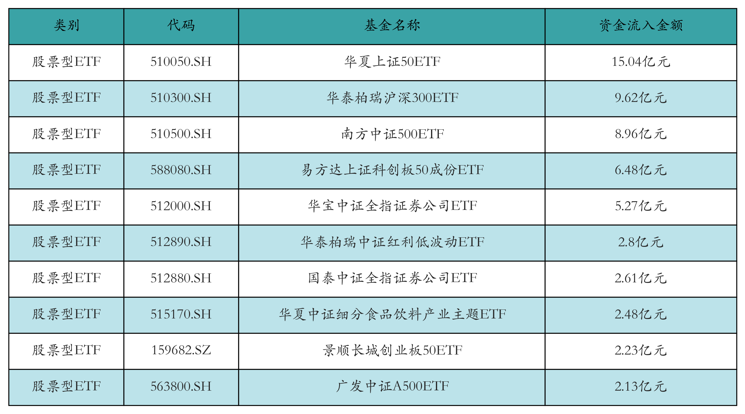 昨日股票型ETF资金流入最多的3只ETF及其流入金额分别为:华夏上证50ETF(流入15.04亿元)、华泰柏瑞沪深300ETF(流入9.62亿元)、南方中证500ETF(流入8.96亿元)。资金流入前10详情见下表: