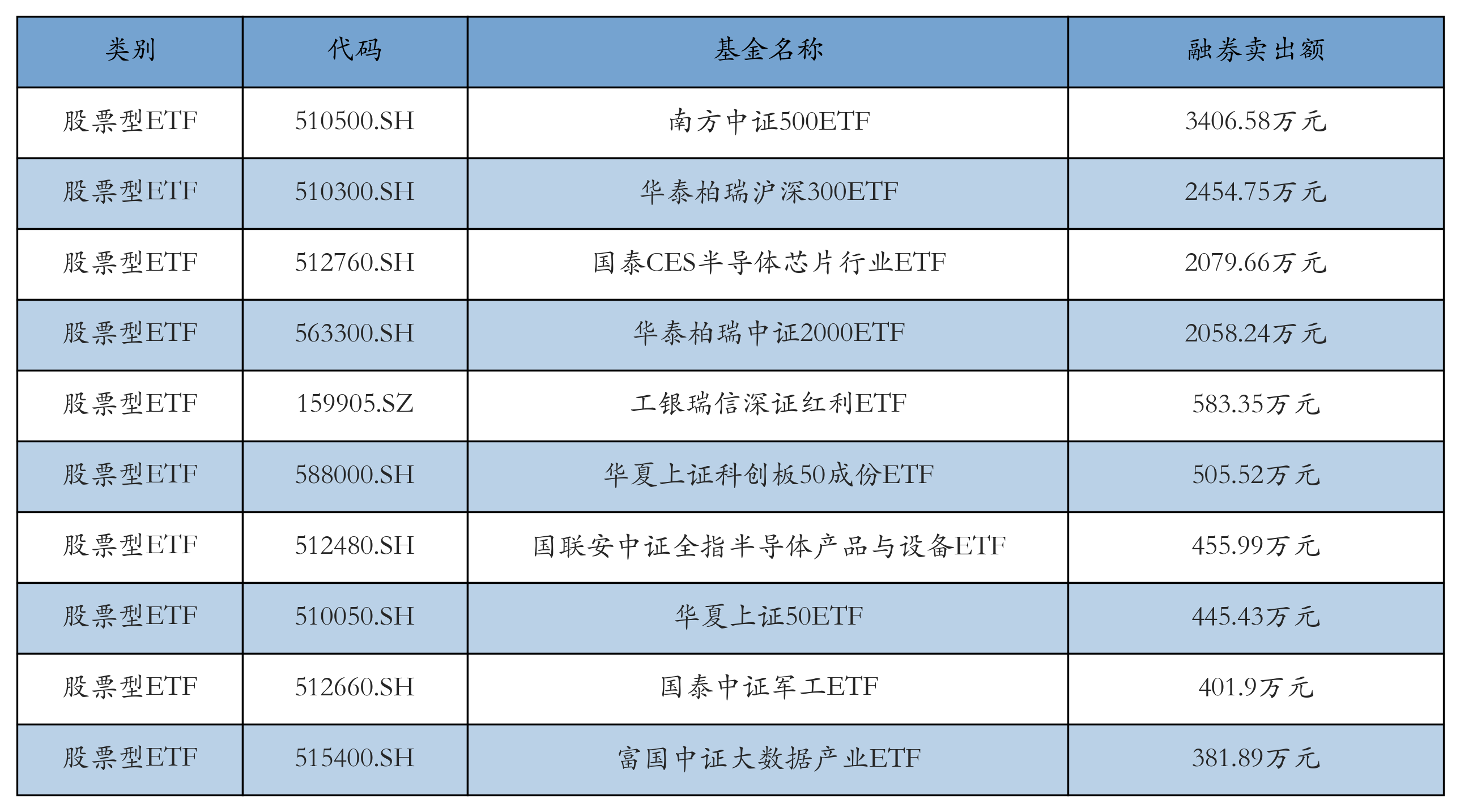 昨日股票型ETF融资卖出额最高的3只ETF及其卖出金额分别为:南方中证500ETF(3406.58万元)、华泰柏瑞沪深300ETF(2454.75万元)、国泰CES半导体芯片行业ETF(2079.66万元)。融券卖出额前10详情见下表: