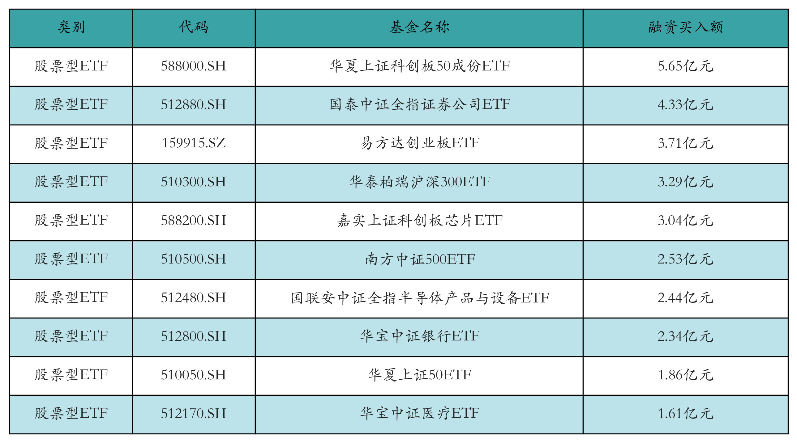 昨日股票型ETF融资买入额最高的3只ETF及其买入金额分别为:华夏上证科创板50成份ETF(5.65亿元)、国泰中证全指证券公司ETF(4.33亿元)、易方达创业板ETF(3.71亿元)。融资买入额前10详情见下表: