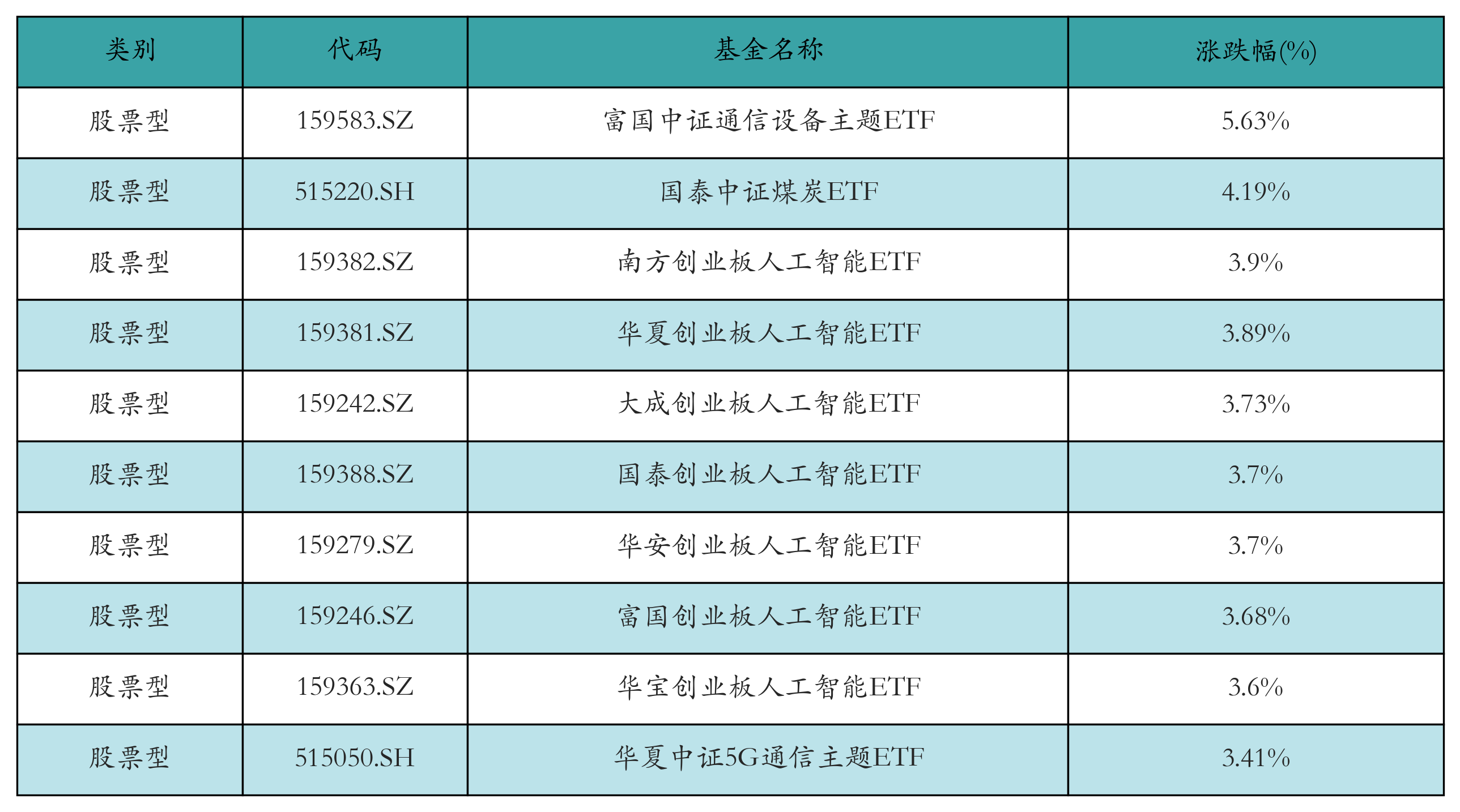 昨日股票型ETF涨幅最高的3只ETF及其收益率分别为:富国中证通信设备主题ETF(5.63%)、国泰中证煤炭ETF(4.19%)、南方创业板人工智能ETF(3.9%)。涨幅前10详情见下表: