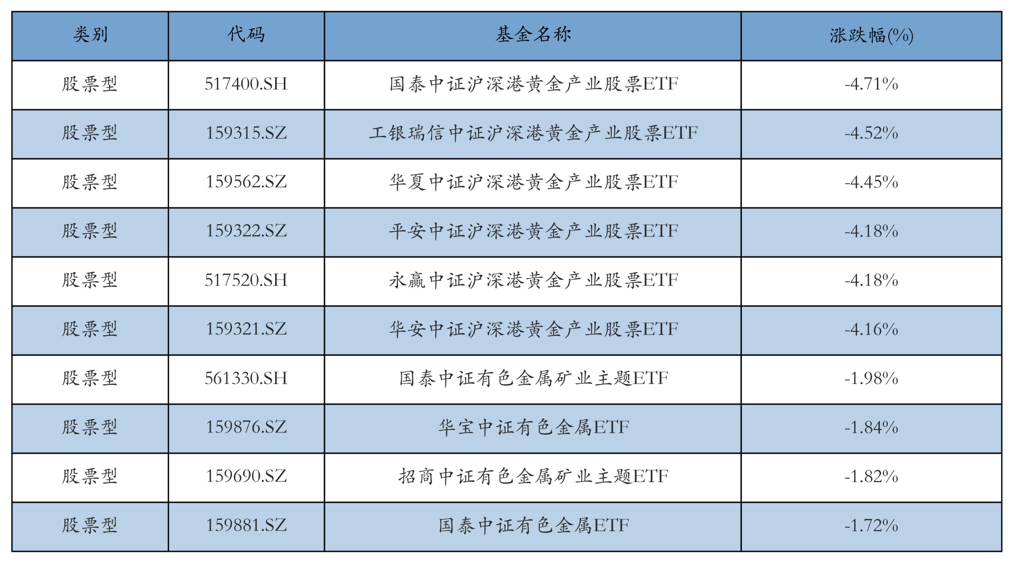昨日股票型ETF跌幅最大的3只ETF及其收益率分别为:国泰中证沪深港黄金产业股票ETF(-4.71%)、工银瑞信中证沪深港黄金产业股票ETF(-4.52%)、华夏中证沪深港黄金产业股票ETF(-4.45%)。跌幅前10详情见下表: