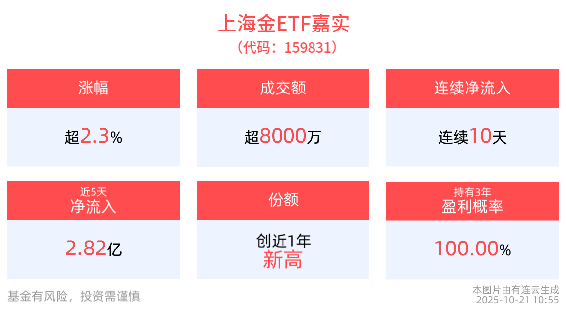 截至10月20日,上海金ETF嘉实近3年净值上涨142.60%。从收益能力看,截至2025年10月20日,上海金ETF嘉实自成立以来,最高单月回报为11.45%,最长连涨月数为6个月,最长连涨涨幅为8.28%,上涨月份平均收益率为3.40%。