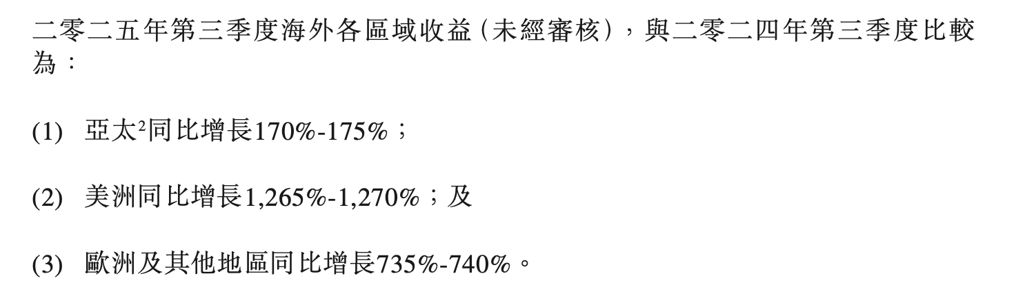 海外业务方面,亚太同比增长170%-175%,美洲同比增长1265%-1270%,欧洲及其他地区同比增长735%-740%。