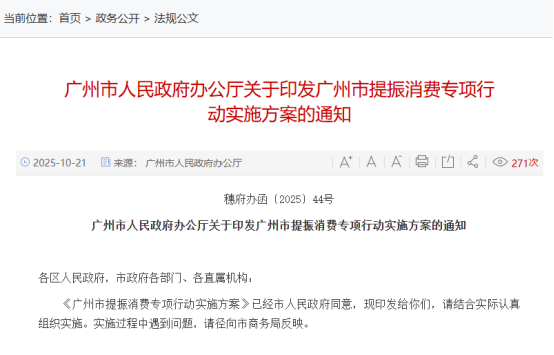 10月21日,广州市人民政府办公厅印发《广州市提振消费专项行动实施方案》(简称《方案》),《方案》从居民增收、服务消费、大宗消费、环境优化等方面提出多项具体任务。
