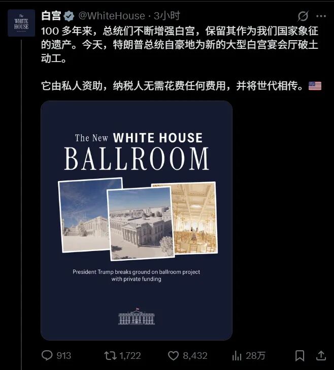 据悉,新宴会厅项目将耗资2.5亿美元,这个项目将取代白宫东翼的部分区域。特朗普特别强调,美国纳税者不必为此承担任何成本,费用均来自慷慨的“真正爱国者”,例如大型公司、美国顶尖财富家族等。