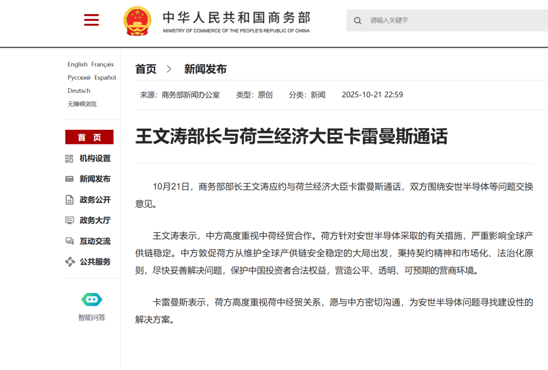 10月21日,商务部部长王文涛应约与荷兰经济大臣卡雷曼斯通话,双方围绕安世半导体等问题交换意见。