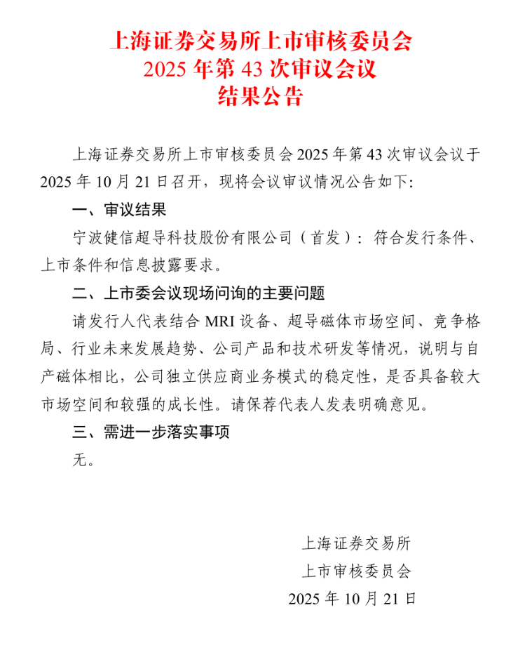 10月21日晚,上海证券交易所上市审核委员会2025年第43次审议会议结果公布,宁波健信超导科技股份有限公司(以下简称“健信超导”)首次公开发行股票并在科创板上市的申请顺利获得审议通过。