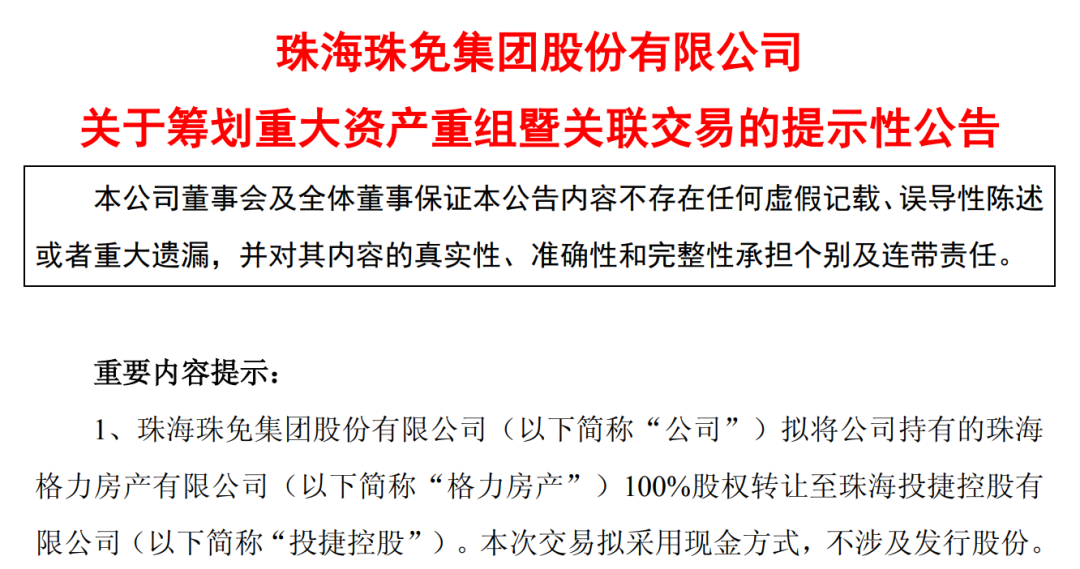 【导读】珠免集团拟转让格力房产100%股权,完全出清房地产业务