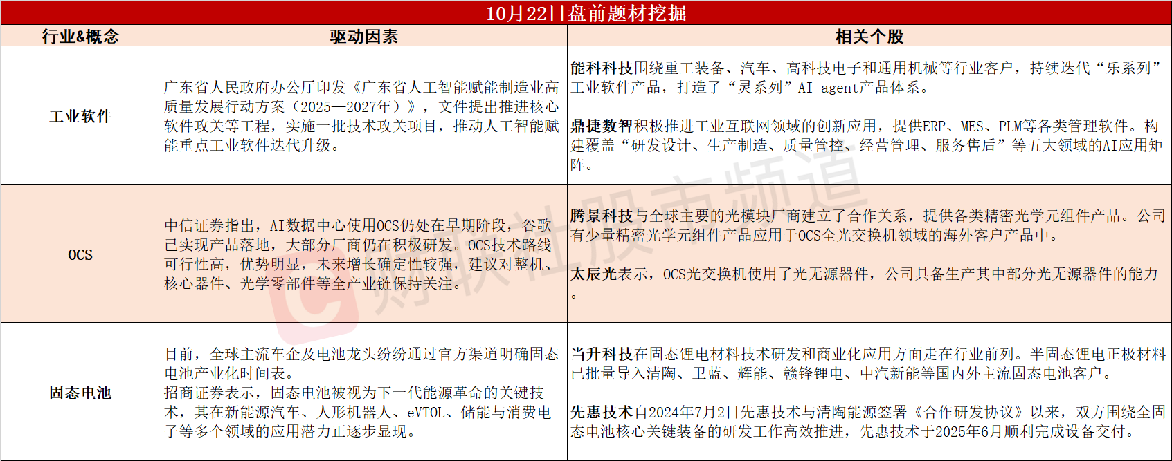 ①广东发文推进核心软件攻关,工业软件有望迎来发展新机遇。②光厂商竞相布局的新战场,机构称OCS未来增长确定性强。③固态电池产业资本开支大增,相关板块投资价值逐步显现。