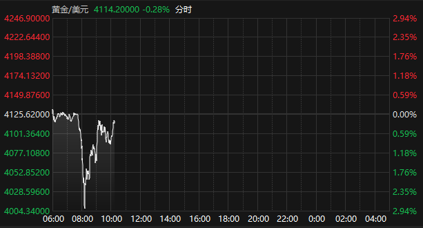 上证报中国证券网讯据Choice数据,10月22日,国际现货黄金盘中短线反弹超100美元/盎司,截至10:15报4114.20美元/盎司,日内跌0.28%。此前一度下跌逼近4000美元/盎司关口。