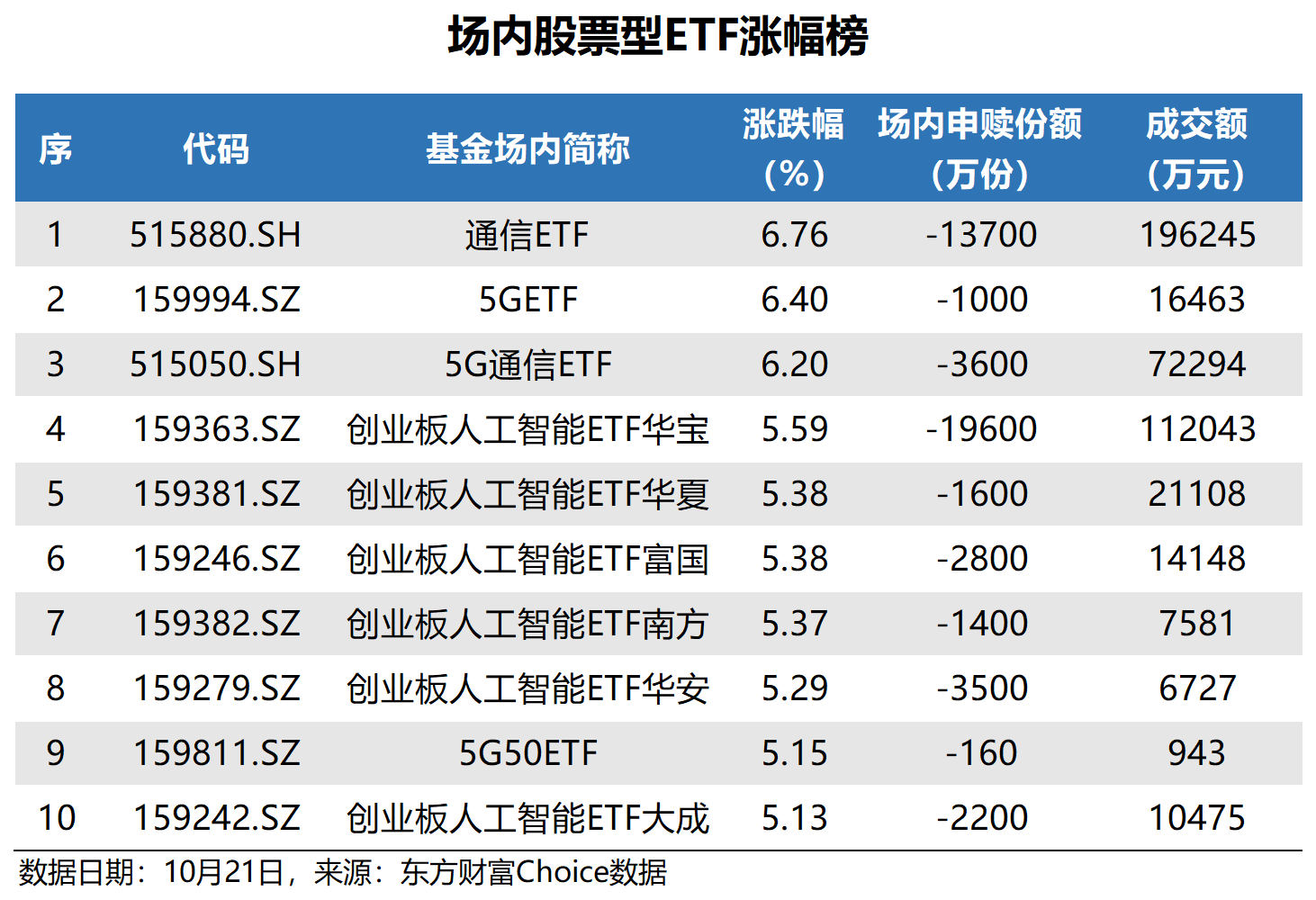 数据显示,昨日场内股票型ETF中,通信ETF、5GETF、5G通信ETF涨幅居前。其中,通信ETF涨幅最大,为6.76%。