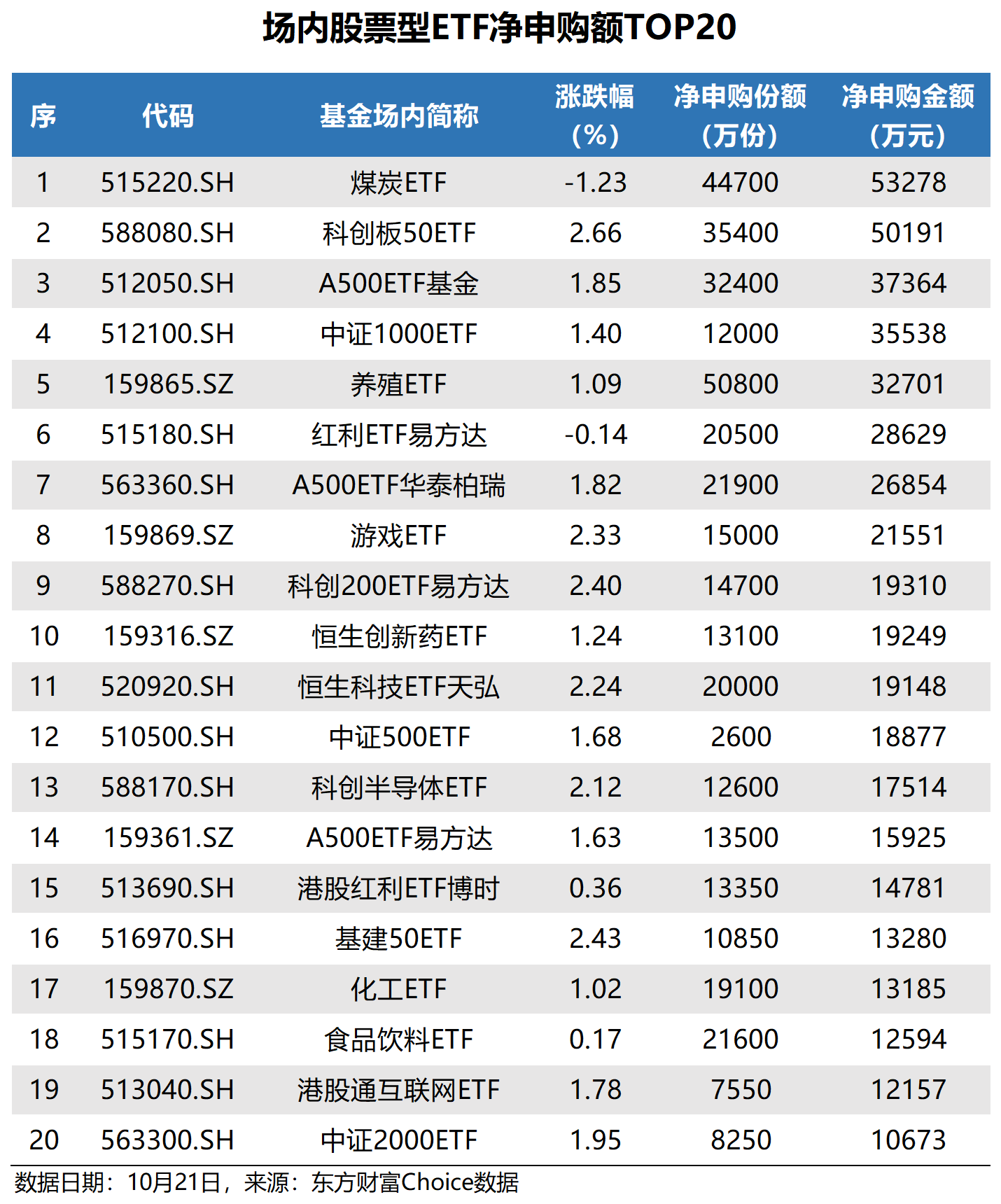 昨日,净申购金额最多的股票型ETF为煤炭ETF,净申购金额为5.33亿元。此外,科创板50ETF和A500 ETF基金也获购居前,净申购金额依次为5.02亿元和3.74亿元。