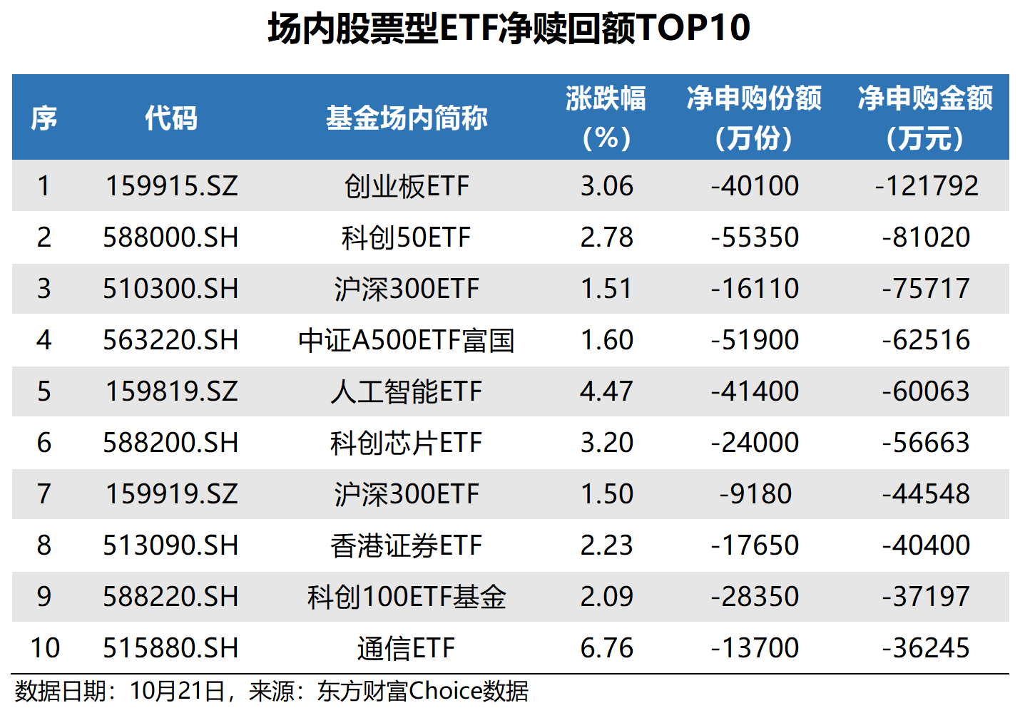 数据还显示,昨日净赎回金额最多的场内股票型ETF为创业板ETF,净赎回金额12.18亿元;科创50ETF紧随其后,净赎回金额8.10亿元。