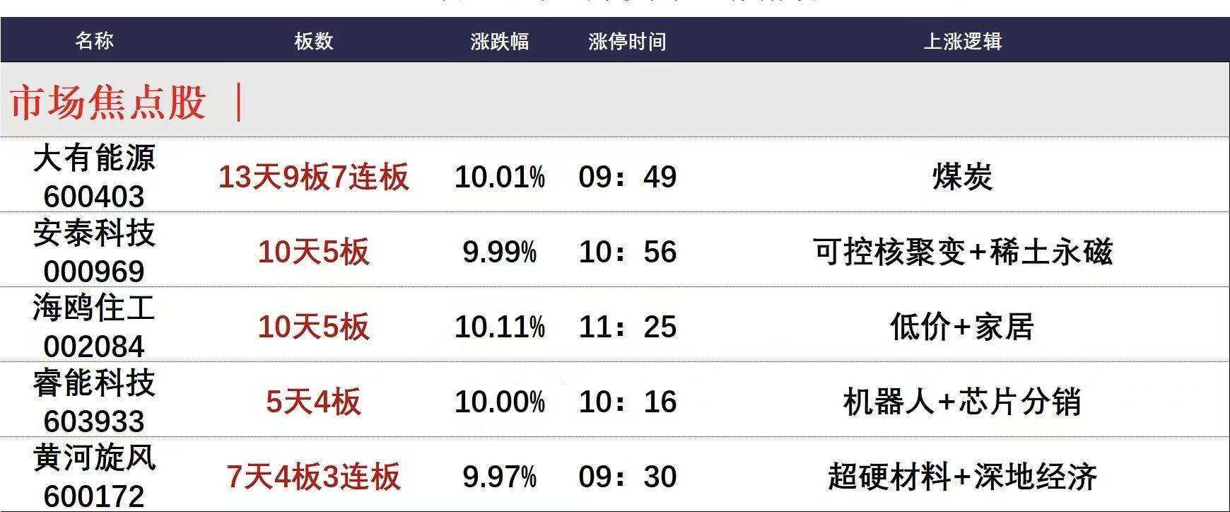 今日午盘全市场共41股涨停,连板股总数18只,19股封板未遂,封板率为68%(不含ST股、退市股)。焦点股方面,大有能源晋级7连板,睿能科技反包涨停走出5天4板,深地经济概念强者恒强,黄河旋风7天4板,神开股份、石化机械、中信重工均录得3连板。