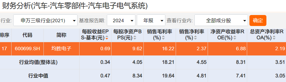 Choice数据显示,汽车电子电气系统行业2024年的销售毛利率的行业均值为18.21%,行业中值为19.64%,而公司毛利率也在20%左右,与行业基本保持一致。