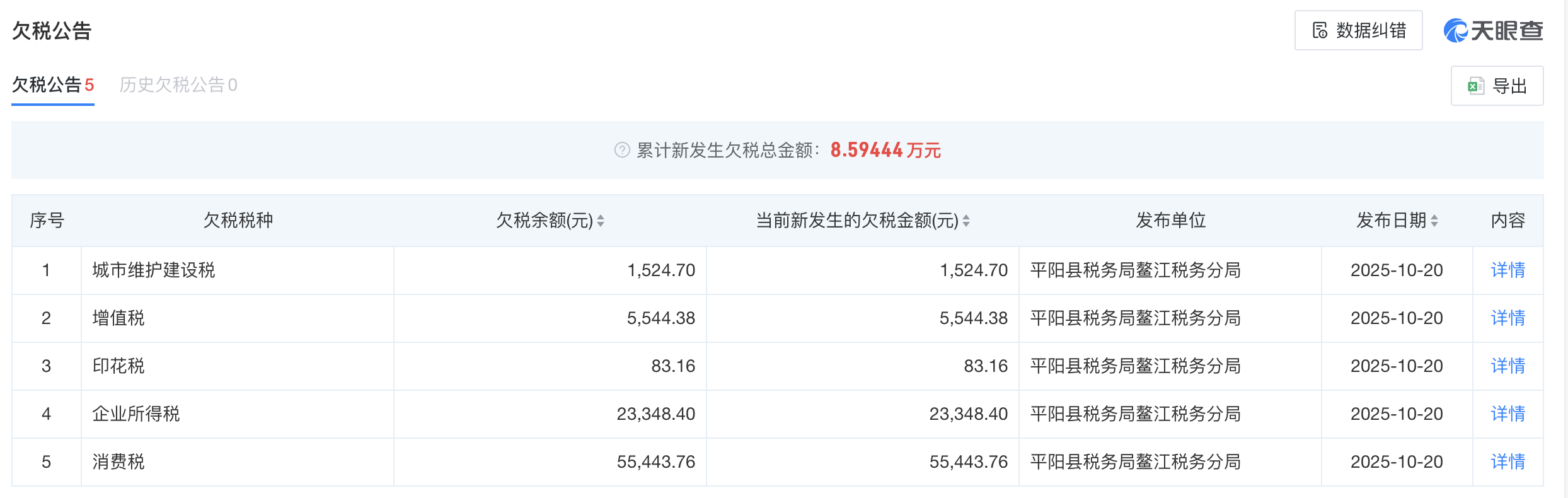 10月22日消息,天眼查APP显示,近日,温州市道莱玉雕有限公司新增5则欠税公告,欠税余额为8.59万余元,欠税税种包括企业所得税、消费税、增值税等。