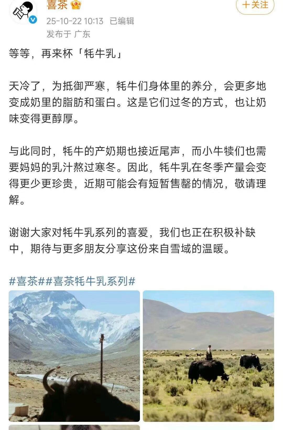 10月22日,喜茶官方微博发布推文表示:寒冬牦牛的产奶期接近尾声,因此,牦牛乳在冬季产量会变得更少更珍贵,近期可能会有短暂售罄的情况,目前正在积极补货中。
