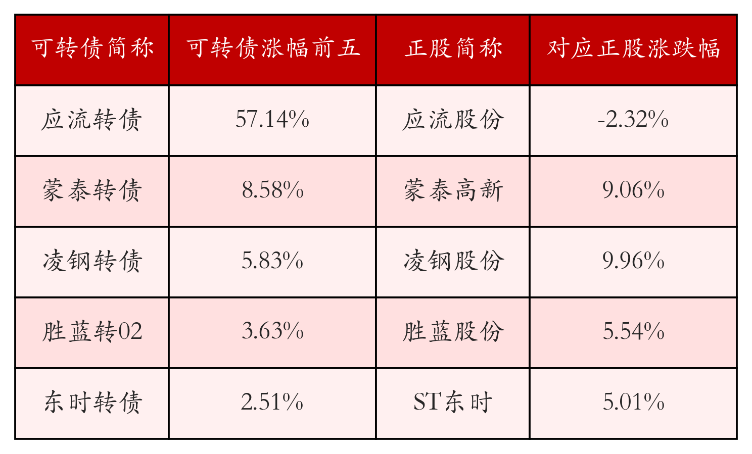 南财智讯10月22日电,南财金融终端盘后数据显示,债市方面,中证转债指数收跌0.39%,报477.31,成交额为527.19亿元。可转债方面,今日共成交409只可转债,其中101只收涨,0只收平,308只收跌。具体来看,7只可转债涨幅超过2%。其中应流转债(113697)涨57.14%,蒙泰转债(123166)涨8.58%,凌钢转债(110070)涨5.83%。今日有21只可转债跌幅超2%,冠中转债(123207)跌9.2%,福新转债(111012)跌4.95%,武进转债(113671)跌4.56%。存在交易量的可转债所对应的正股中,157只收涨,16只收平,236只收跌。具体来看,9只可转债对应正股涨幅超过5%,其中,三房巷(600370)涨停,收涨10.0%;莱克电气(603355)涨停,收涨9.99%;凌钢股份(600231)涨停,收涨9.96%。同时所对应的可转债:三房转债(110092)同涨1.44%;莱克转债(113659)同涨1.77%;凌钢转债(110070)同涨5.83%。今日有5只可转债对应正股跌幅超过5%,没有正股跌停。