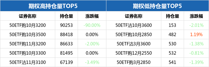从持仓量来看,50ETF期权合约中,50ETF购10月3200持仓量最大,为90253张,期权全日下跌90.00%,报收0.0001元;持仓量最小的为50ETF沽10月3600,共计153张,期权全日下跌2.01%,报收0.4486元。
