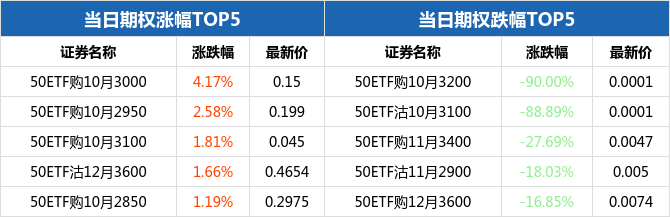 50ETF期权当日有102个合约正在交易。从涨跌幅来看,50ETF期权合约中,50ETF购10月3000涨幅最大,为4.17%,报收0.15元;50ETF购10月3200跌幅最大,为90.00%,报收0.0001元。