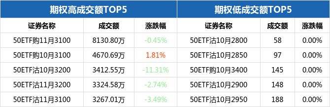 从成交额来看,50ETF期权合约中,50ETF购11月3100成交额最高,为8130.8万元,全日下跌0.45%,报收0.0882元;而最低的为50ETF沽10月2800,成交额为58元,全日收平,报收0.0001元。