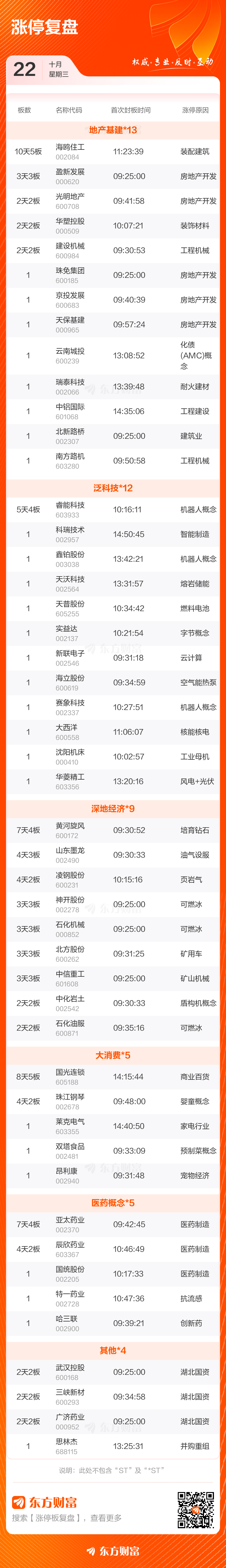 10月22日涨停复盘:72股涨停 海鸥住工10天5板