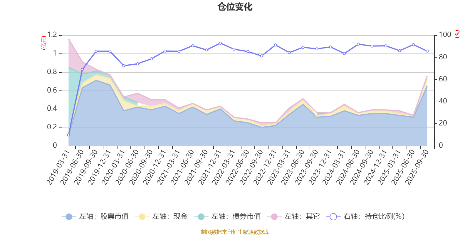 据定期报告数据统计,近三年平均股票仓位为88.42%,同类平均为72.12%。2021年末基金达到92.82%的最高仓位,2019年一季度末最低,为9.84%。
