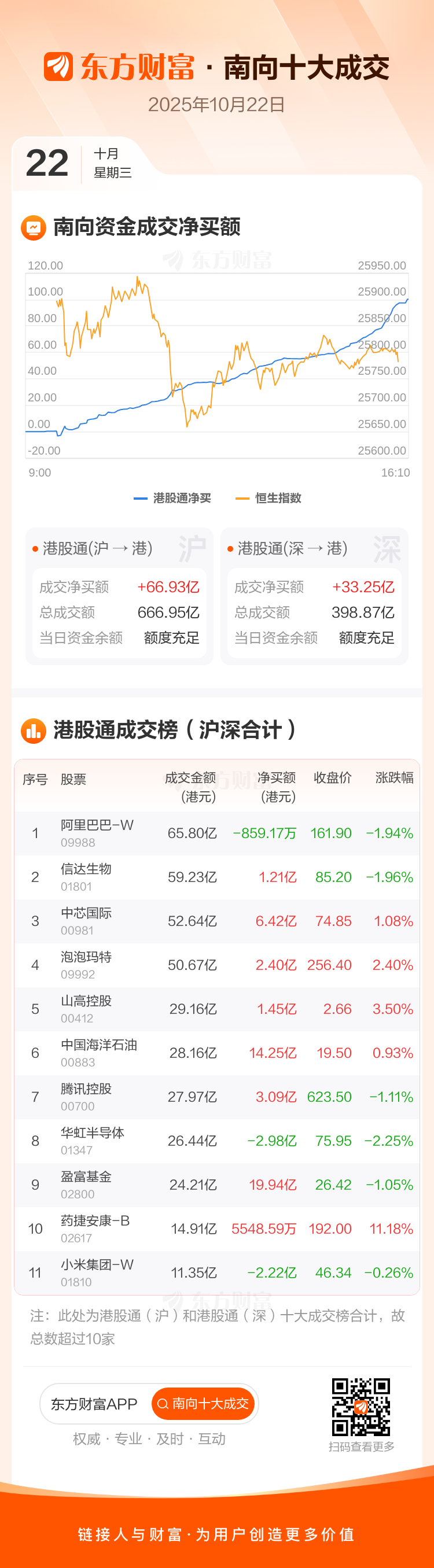 10月22日南向资金净买逾100亿港元,逾19亿抢筹盈富基金