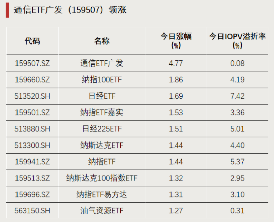 通信ETF广发(159507)上涨4.77%,领涨全市场ETF,多只纳指和日经ETF涨幅居前。