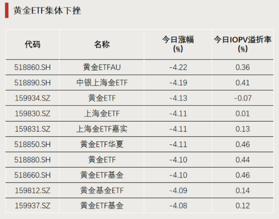 ETF方面,受国际金价下跌影响,黄金ETF再度集体下挫,跌幅榜前十均为黄金ETF。