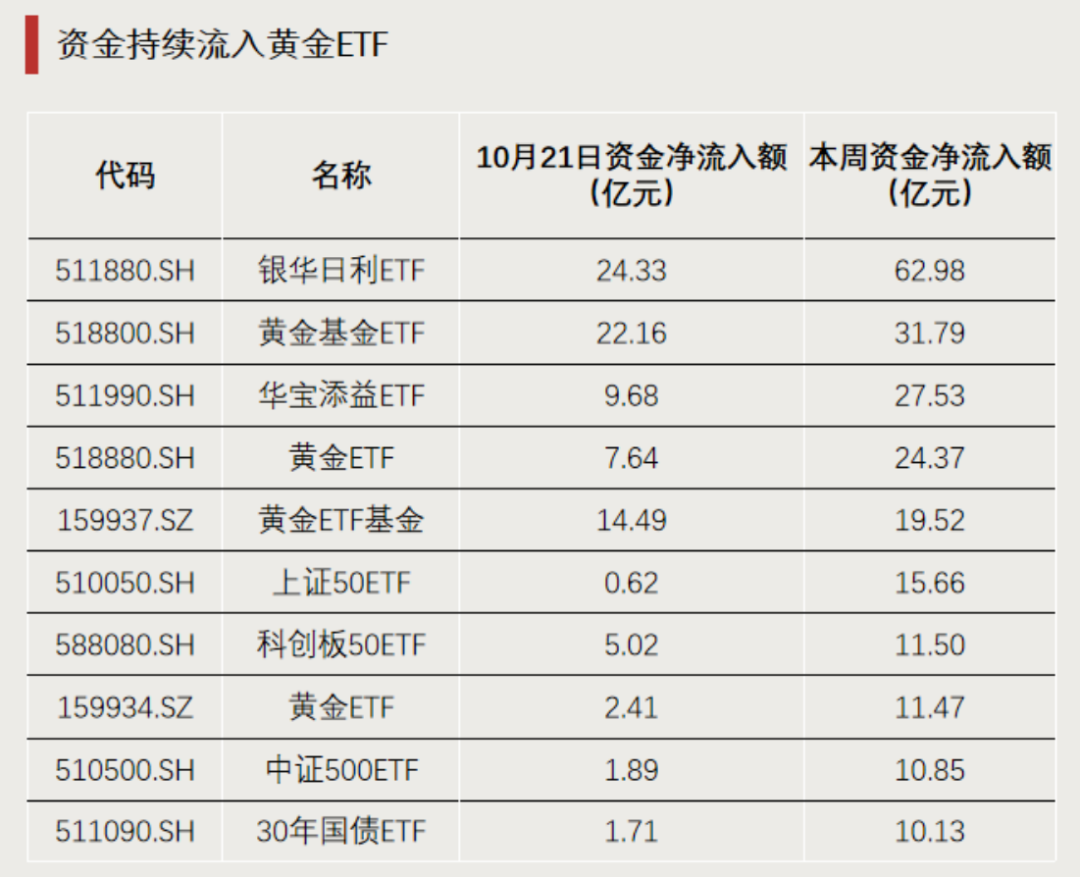 10月22日,受国际金价下跌影响,黄金ETF再度集体下挫,跌幅榜前十均为黄金ETF。