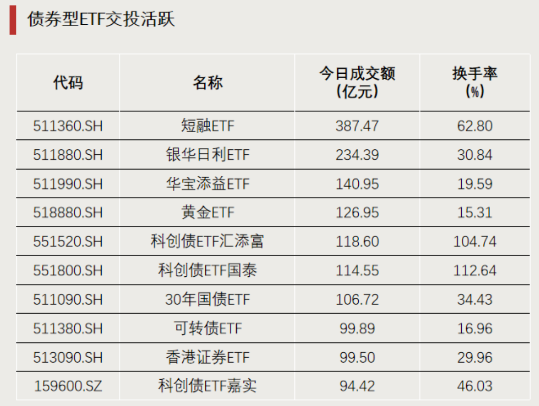 多只债券型ETF交投活跃,科创债ETF汇添富(551520)和科创债ETF国泰(551800)换手率均超过100%。