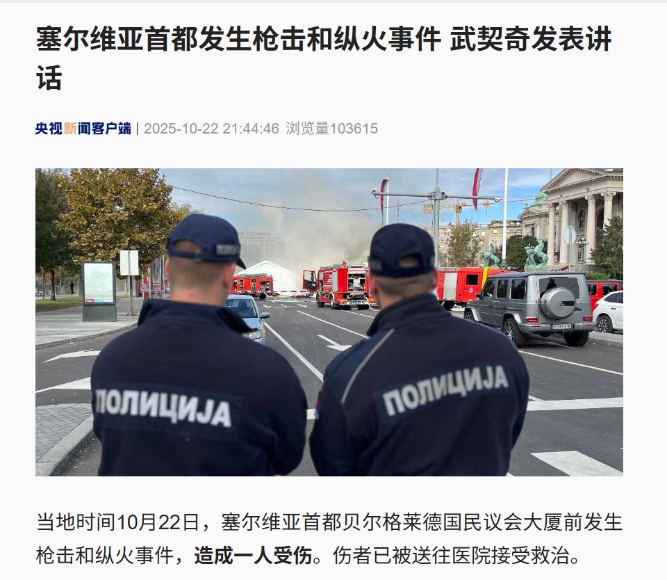 据新华社,塞尔维亚首都贝尔格莱德国民议会大厦门前22日发生枪击和纵火事件,造成1人受伤。塞总统武契奇说,这是一起恐怖袭击事件。