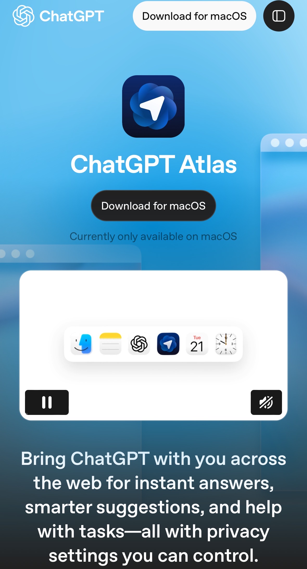 Atlas以ChatGPT为核心,ChatGPT融入产品结构中,因此它始终在附近并随时可用。在使用ChatGPT Atlas中,ChatGPT可以看到所在的页面,并通过Ask ChatGPT侧边栏直接回答问题。