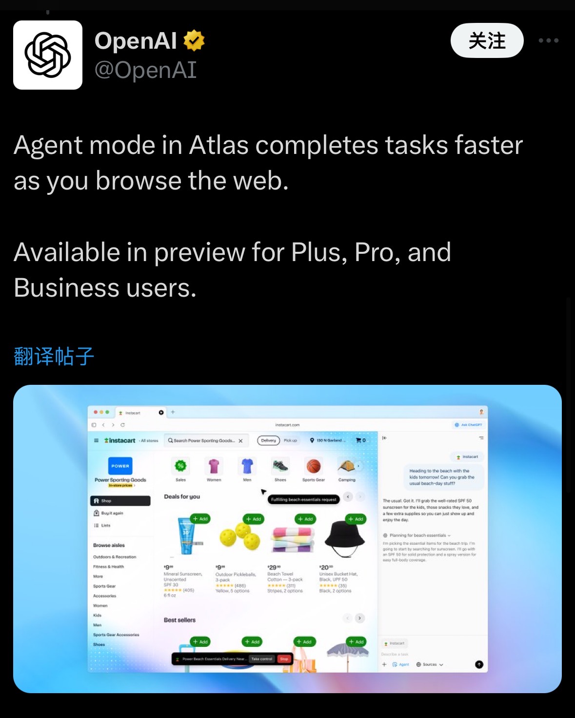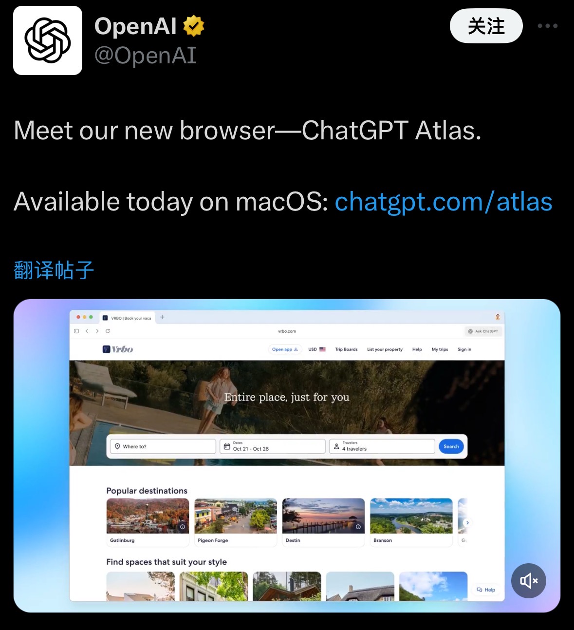 “我去年加入@OpenAI时,我只有一个想法:将世界上最好的人工智能助手置于浏览体验的核心,将改变我们在线完成工作的方式。从那时起,我们已经能够建立一支令人难以置信的团队,今天我们很高兴发布一款全新的产品:ChatGPT Atlas——一款专为人工智能时代设计的新型网络浏览器——这个时代将由更多的人类自然语言交互、代理和最终的 AGI 塑造。”Ben Goodger说。