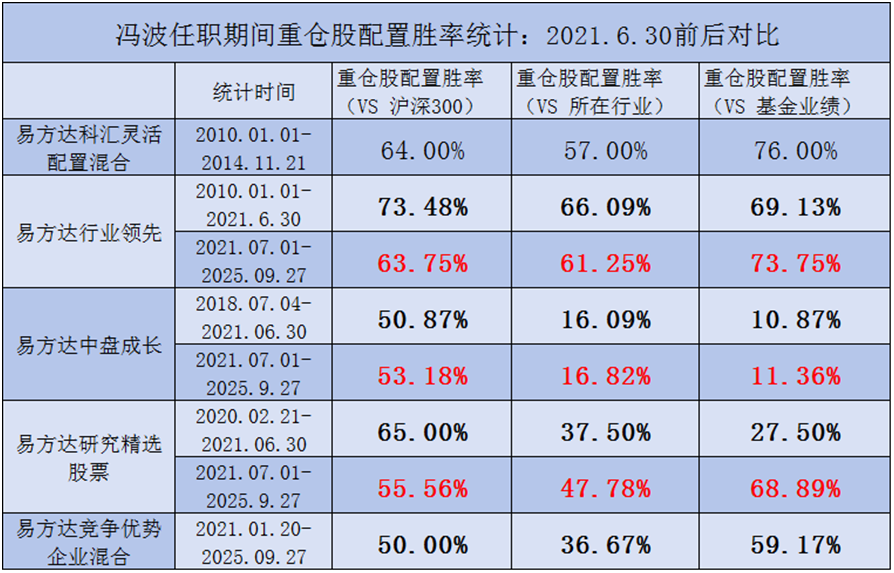 从冯波在管产品的管理运作过程看,根据其任期内基金定期报告统计,以重仓股报告期内涨跌幅与沪深300、重仓股所在申万一级行业指数(2021)和基金当期净值增长率进行对比,重仓股的涨幅更大或跌幅更小代表当期配置胜出,从而得出统计时间区间内的配置胜率。根据过往不完全统计,主动股基要取得较好的业绩表现,重仓股的平均行业配置胜率及相对于沪深300的平均配置胜率,几乎都需要在50%以上。