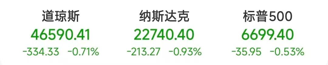 截至收盘,道指跌334.33点,跌幅为0.71%,报46590.41点;纳指跌213.27点,跌幅为0.93%,报22740.40点;标普500指数跌35.95点,跌幅为0.53%,报6699.40点。