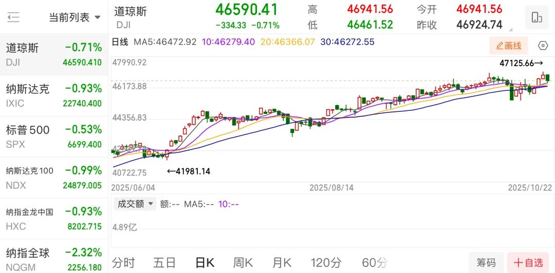 截至收盘,道指跌334.33点,跌幅0.71%,报46590.41点;纳指跌213.27点,跌幅0.93%,报22740.40点;标普500指数跌35.95点,跌幅0.53%,报6699.40点。