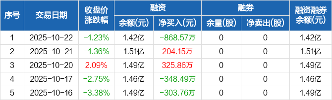 天秦装备:融资净偿还868.57万元,融资余额1.42亿元(10-22)
