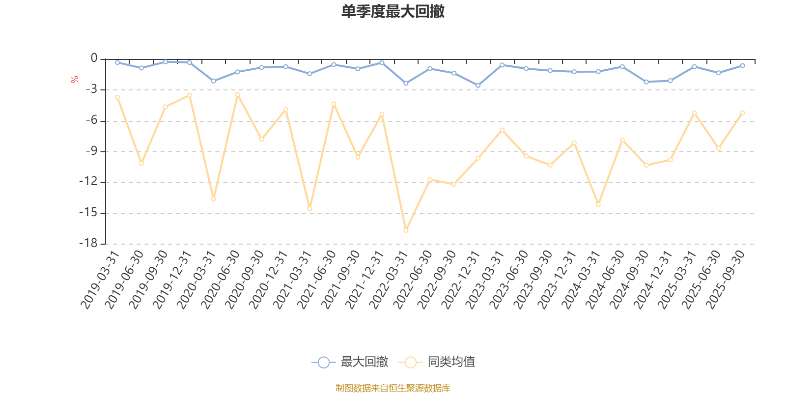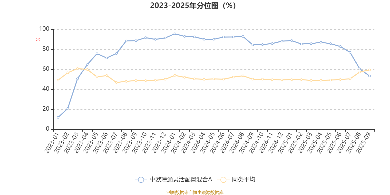 通过所选区间该基金净值增长率分位图,可以观察该基金与同类基金业绩比较情况。图为坐标原点到区间内某时点的净值增长率在同类基金中的分位数。