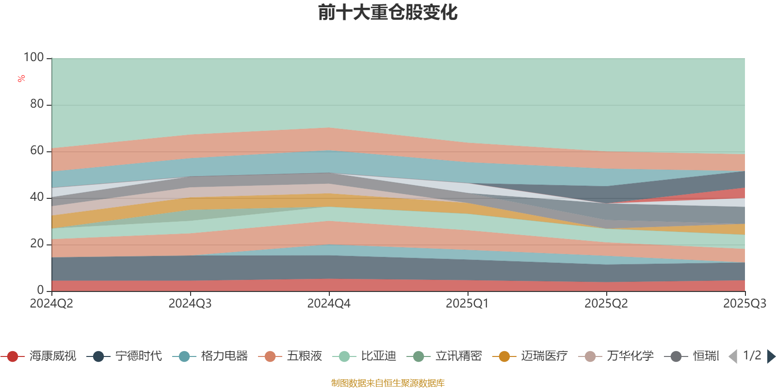 该基金持股集中度较高,且持股标的较为稳定。截至2025年三季度末,基金十大重仓股分别是宁德时代、阿里巴巴-W、贵州茅台、腾讯控股、比亚迪、五粮液、迈瑞医疗、海康威视、药明康德、山西汾酒。
