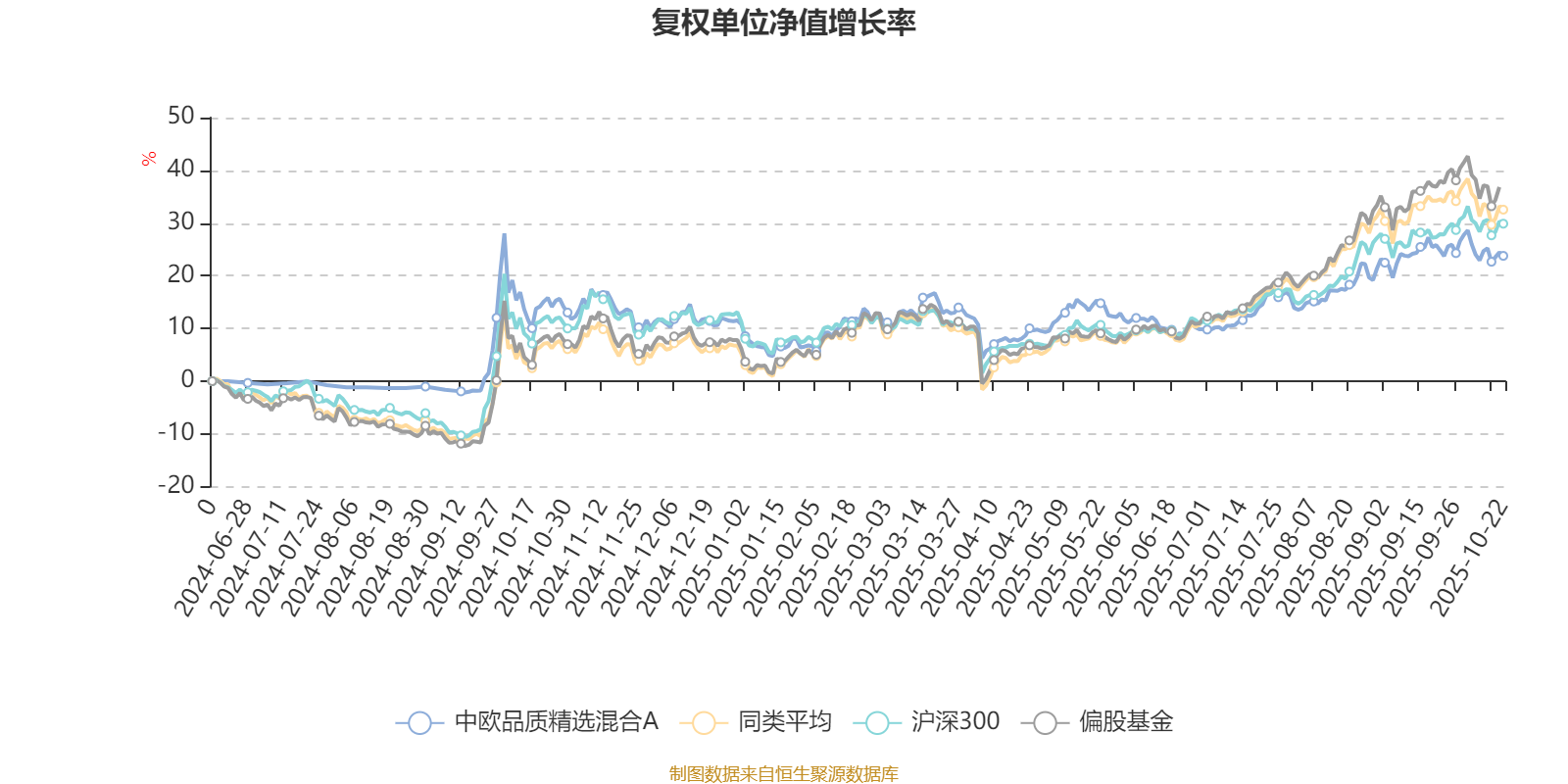 截至10月22日,中欧品质精选混合A近三个月复权单位净值增长率为6.43%,位于同类可比基金510/689;近半年复权单位净值增长率为13.89%,位于同类可比基金556/687;近一年复权单位净值增长率为7.51%,位于同类可比基金581/652。