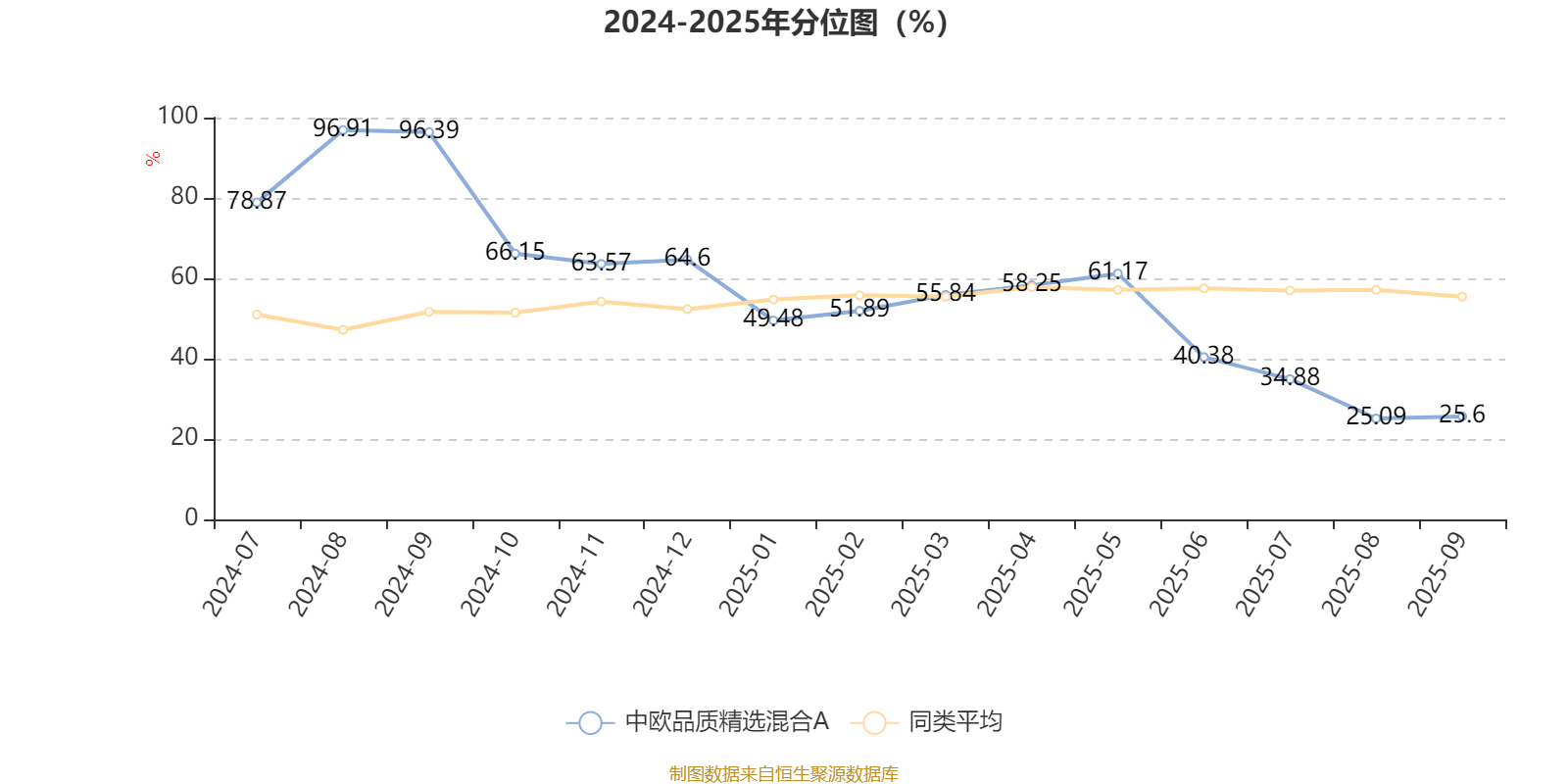 通过所选区间该基金净值增长率分位图,可以观察该基金与同类基金业绩比较情况。图为坐标原点到区间内某时点的净值增长率在同类基金中的分位数。