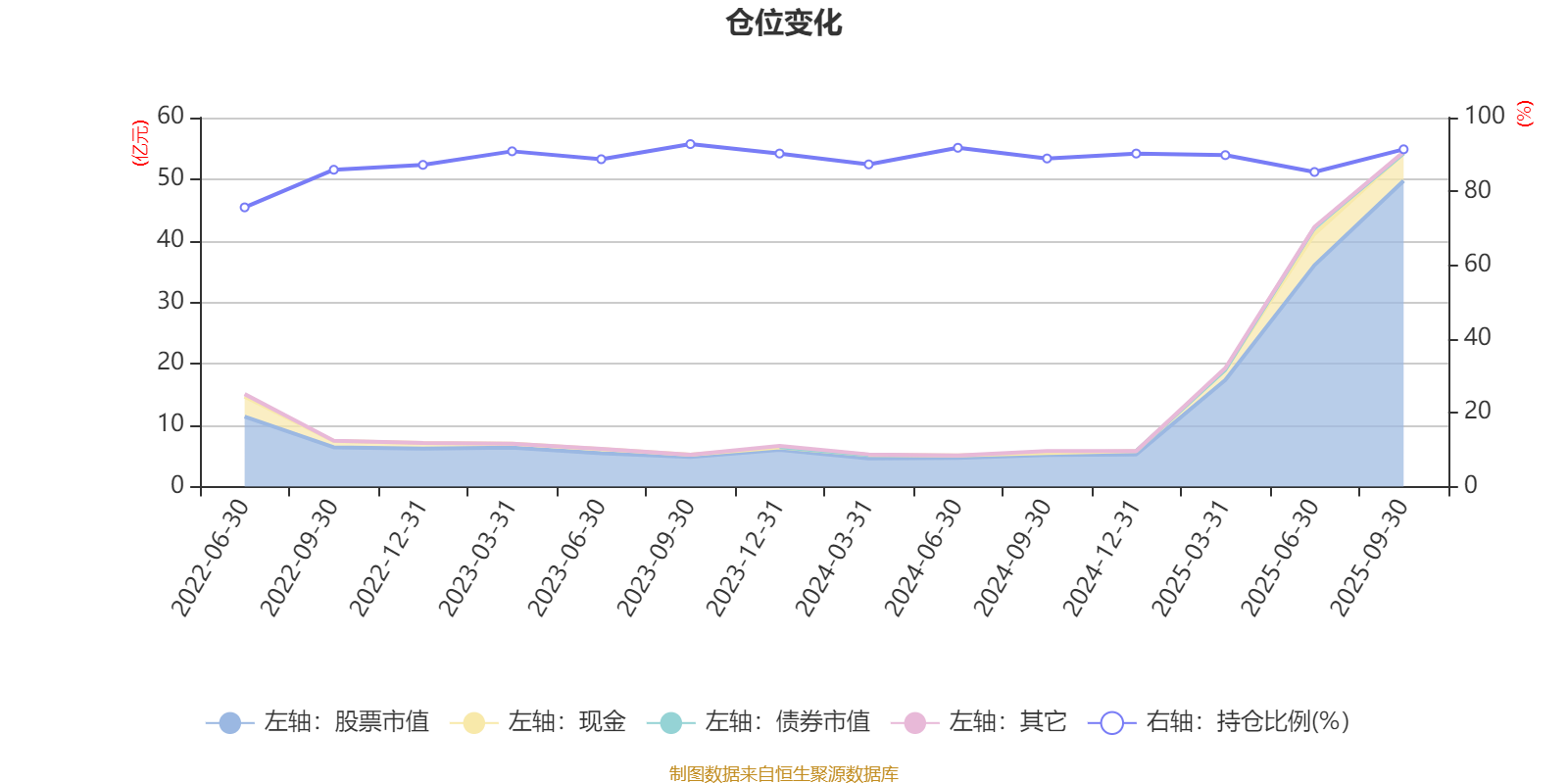 据定期报告数据统计,近三年平均股票仓位为89.56%,同类平均为67.2%。2023年三季度末基金达到92.82%的最高仓位,2022年上半年末最低,为75.67%。