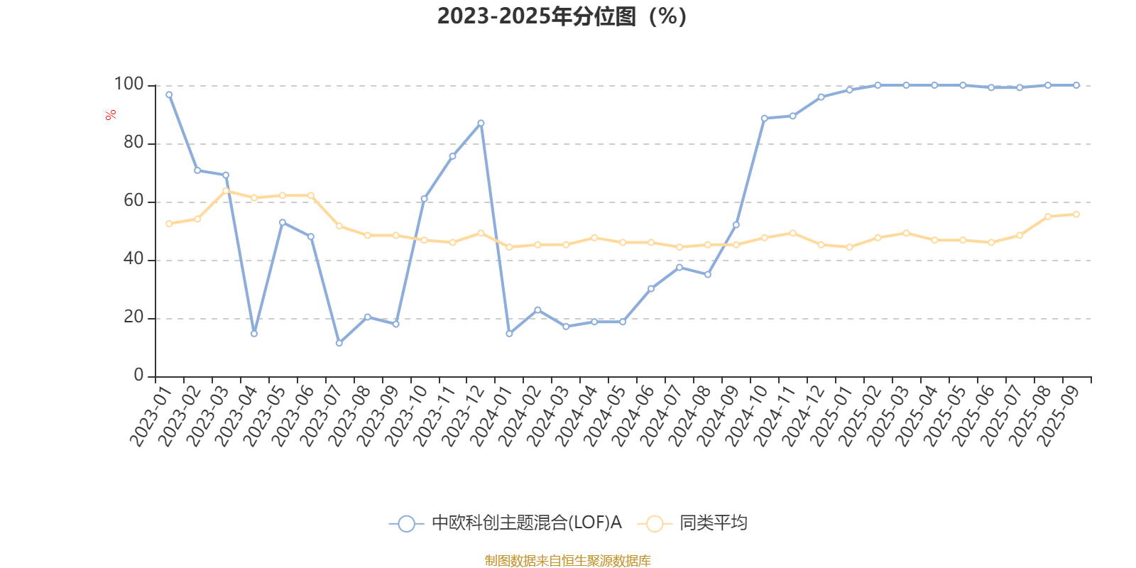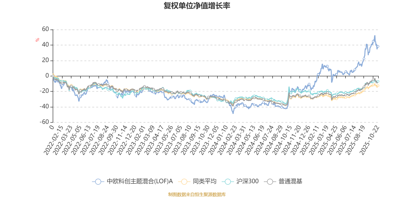 截至10月22日,中欧科创主题混合(LOF)A近三个月复权单位净值增长率为24.00%,位于同类可比基金13/134;近半年复权单位净值增长率为36.17%,位于同类可比基金20/134;近一年复权单位净值增长率为64.80%,位于同类可比基金3/130;近三年复权单位净值增长率为81.88%,位于同类可比基金1/119。