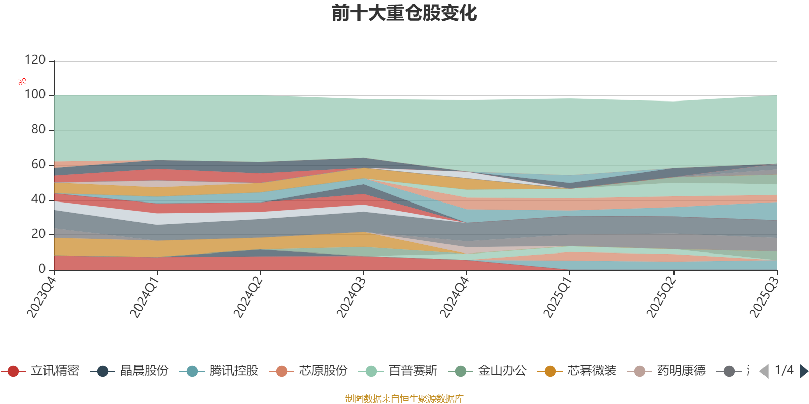 基金管理人在三季报中表示,第三季度我们提到的 AI 推理模型的模型维度、模型记忆、推理速度和推理成本技术行业进步都很明显,AI 基座的算力、运力和存力都在股价和行业层面得到了验证。我们看到中国优质企业在智能汽车、先进制程、自研芯片 IP、下一代智能终端等高技术附加值领域都实现了技术突破和赶超,我们会继续挖掘投资有价值空间的公司。